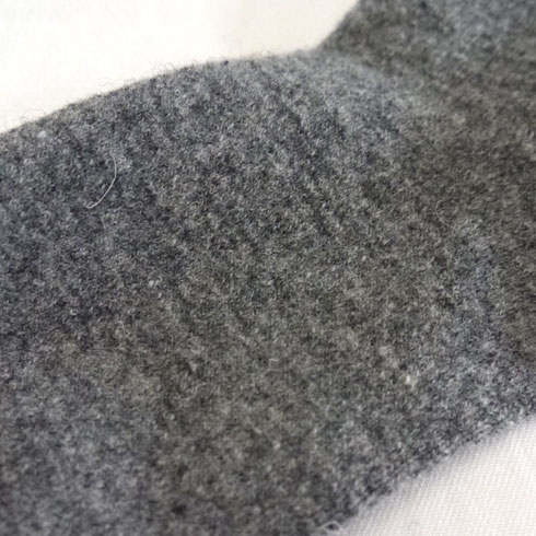 ハイソックスに近いくらい長めに編み立て、一緒に編んだストレッチ糸の伸縮を利用してギュッと凝縮するように縮めることで、まるでメルトンの様な雰囲気のしっかりとした生地に仕上げてあります。